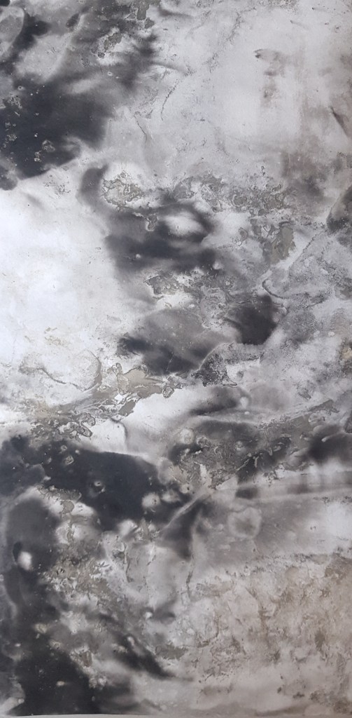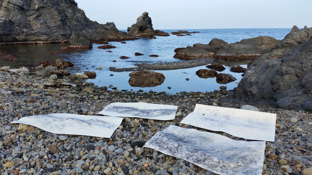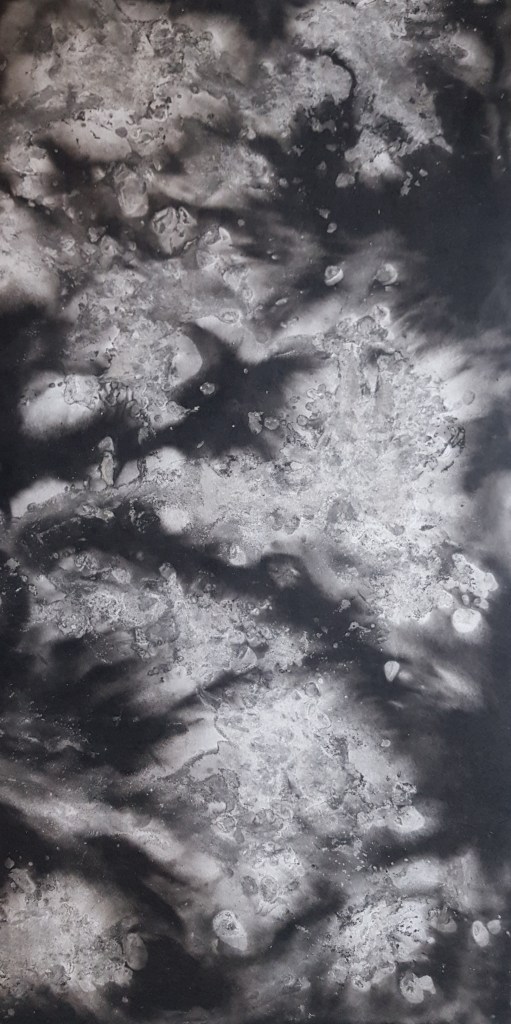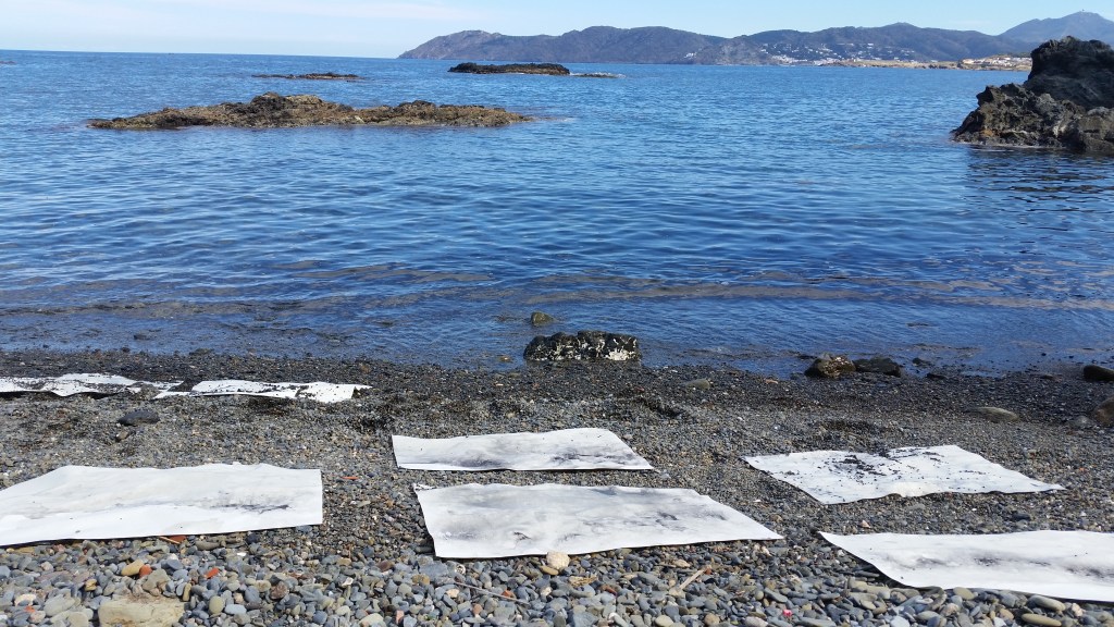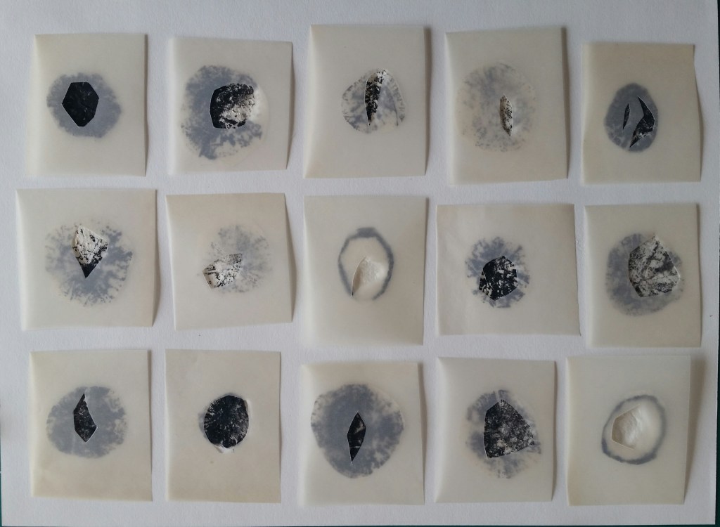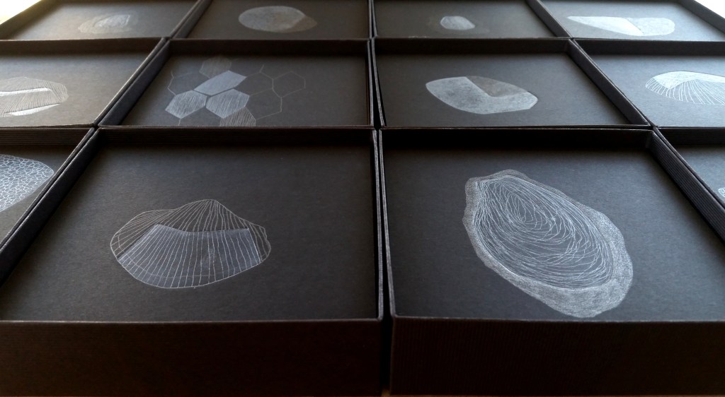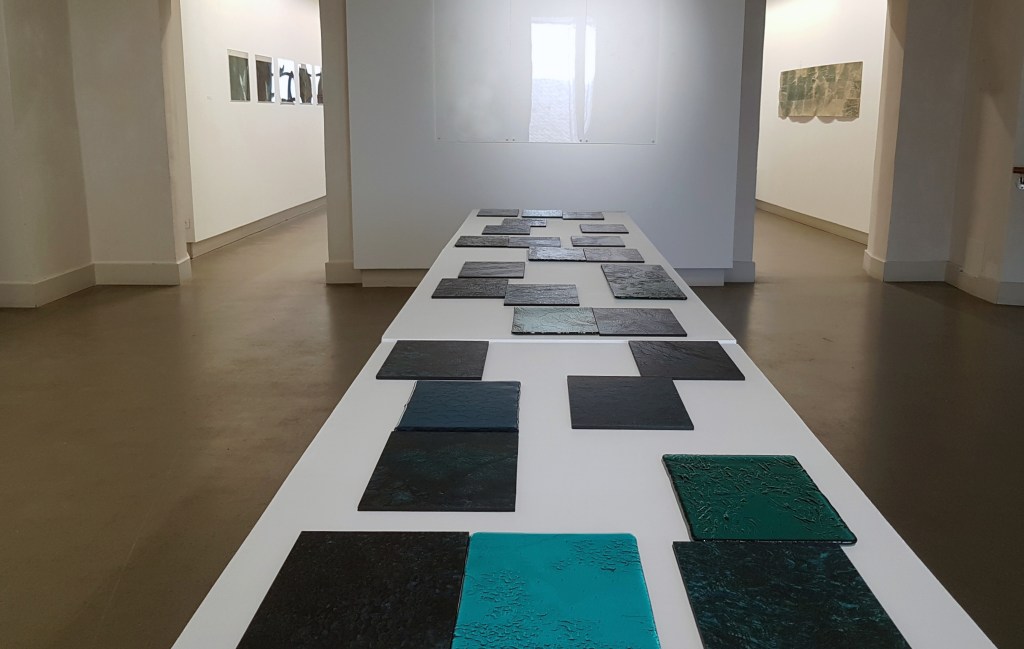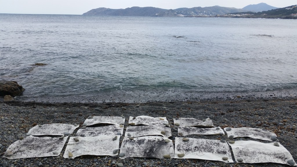 Monotypes des vagues, encre de Chine sur papier 43x61cm – 2019Pièces manquantes, zincs gravés à l’eau-forte et divers objets collectés en bord de mer et tirages sur papier noir, présentés dans boite 14x14cm – 2019Le poids de la lumière, suite Installation de 36 papiers argentés du Laos gravés et encrés et leur tirage sur papier gravure, 182x110cm – 2018
