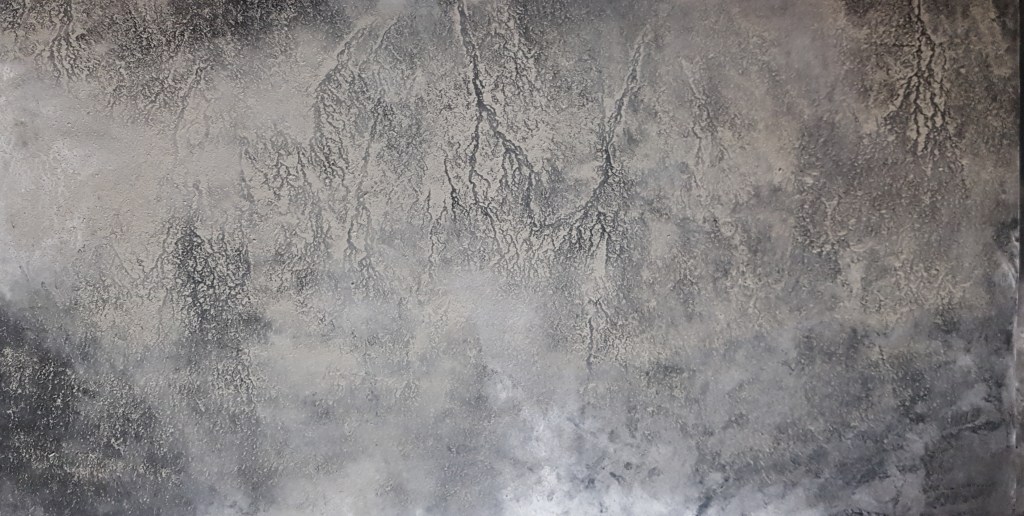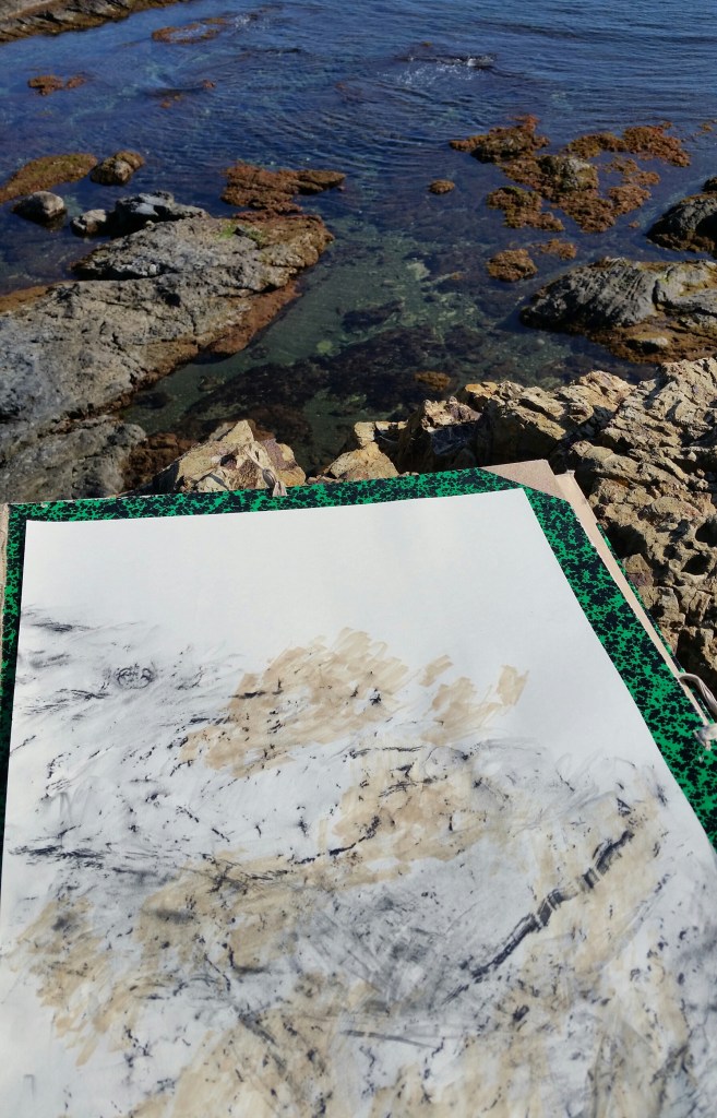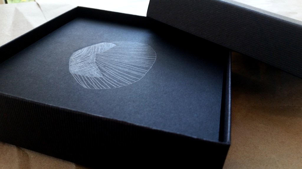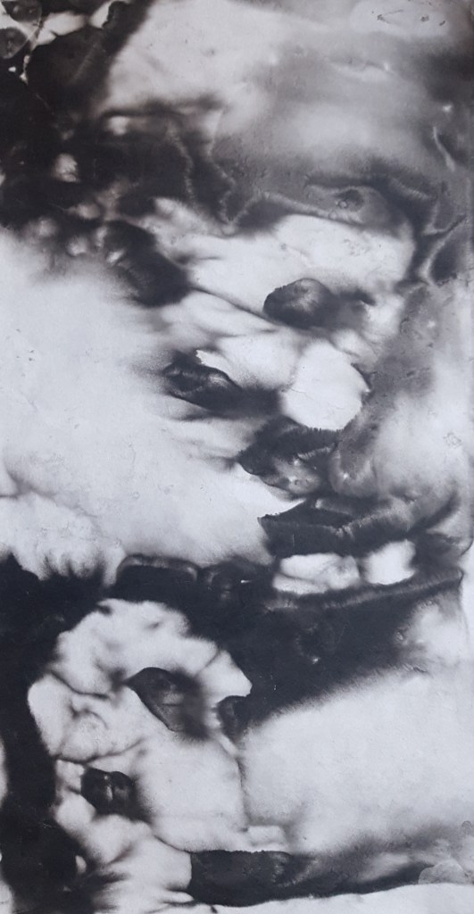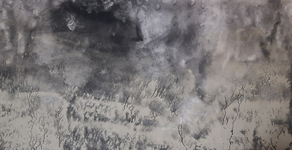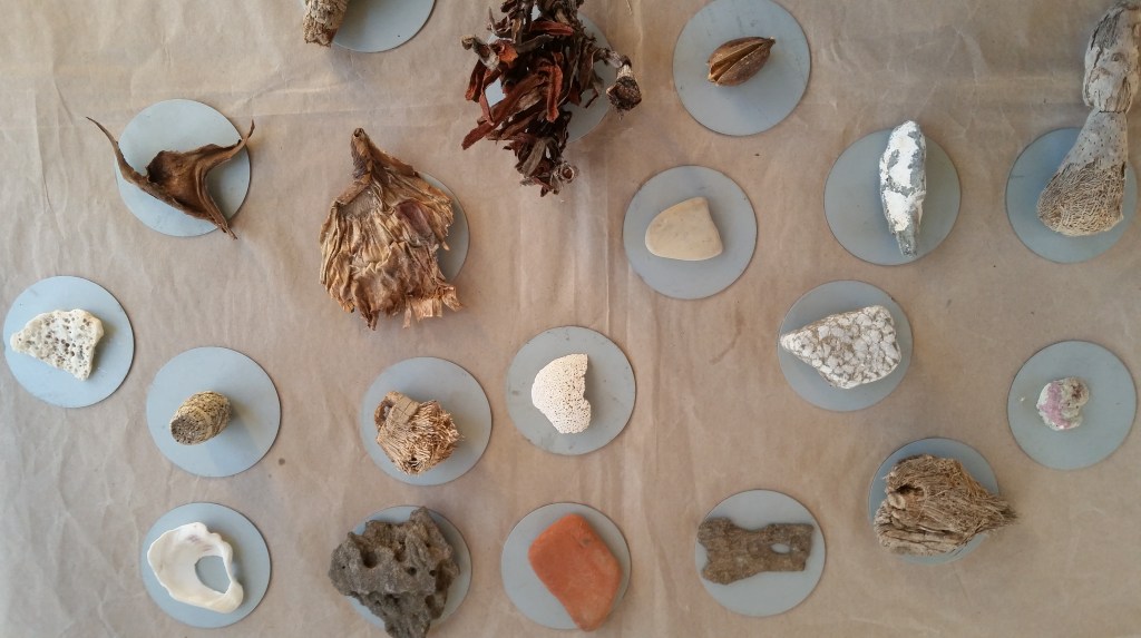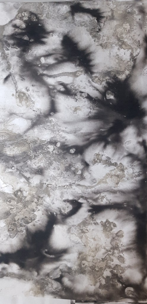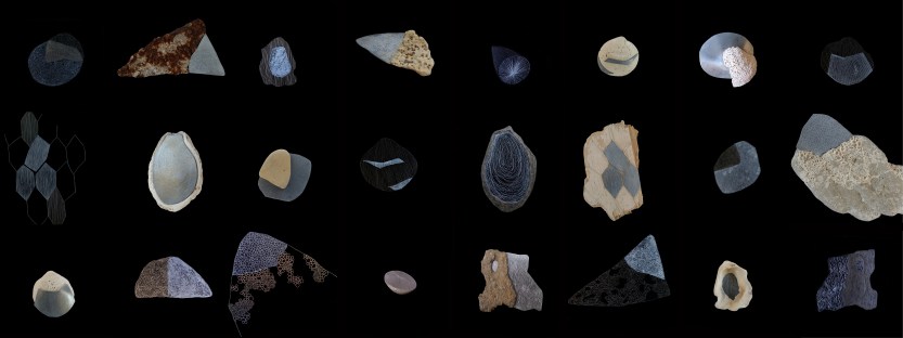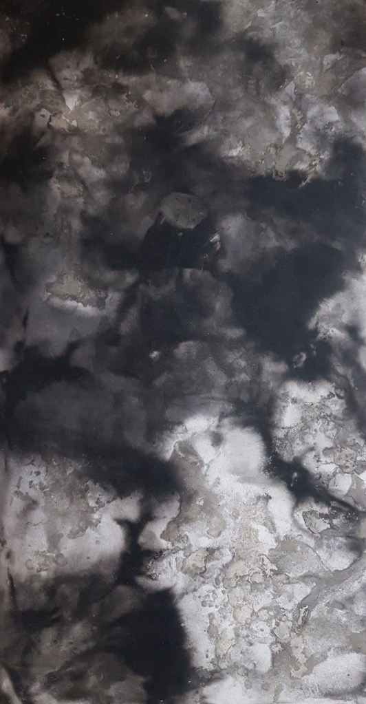 Monotypes des vagues, encre de Chine sur papier 43x61cm – 2019Pièces manquantes, zincs gravés à l’eau-forte et divers objets collectés en bord de mer et tirages sur papier noir, présentés dans boite 14x14cm – 2019Le poids de la lumière, suite Installation de 36 papiers argentés du Laos gravés et encrés et leur tirage sur papier gravure, 182x110cm – 2018