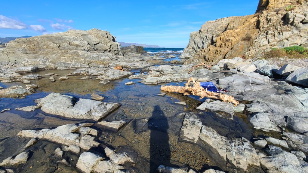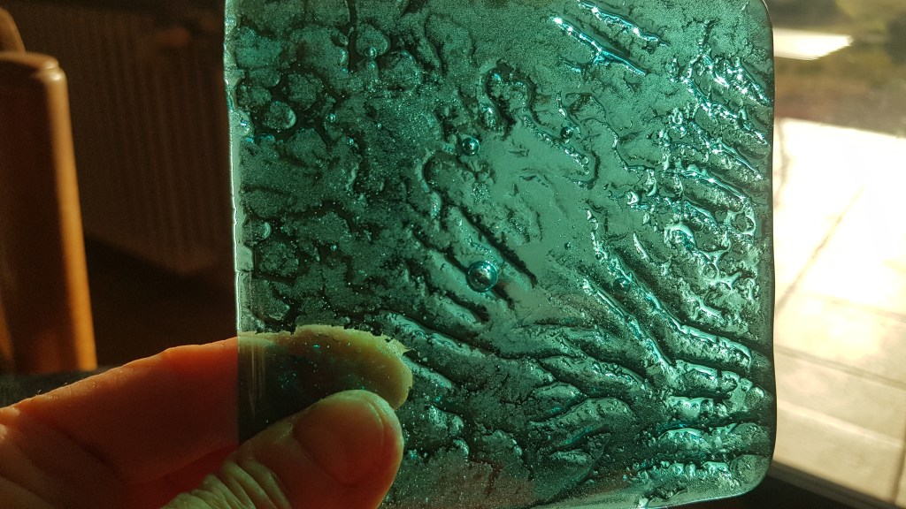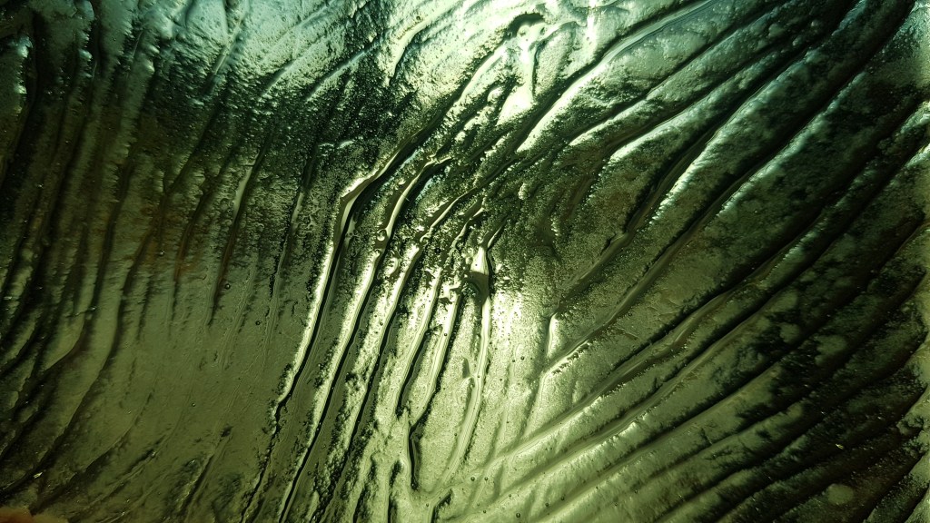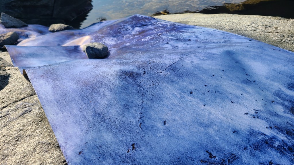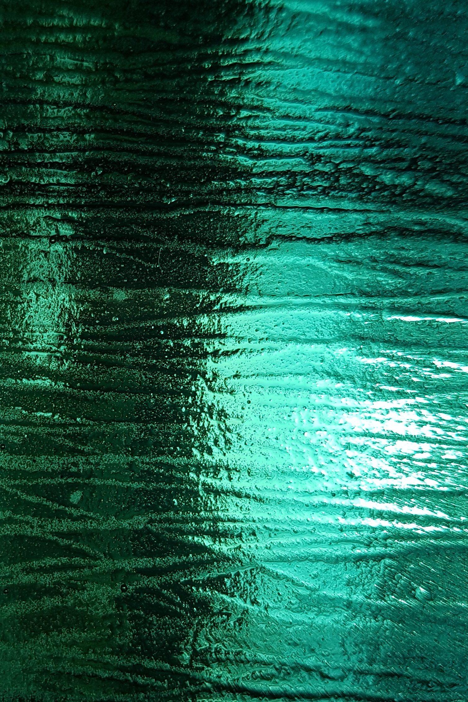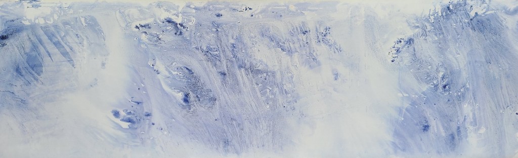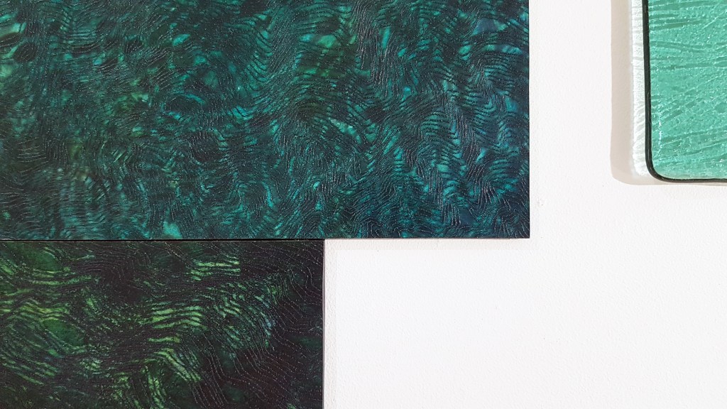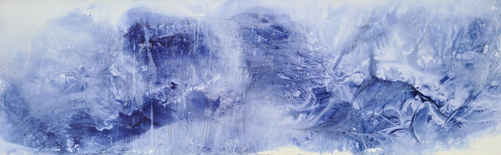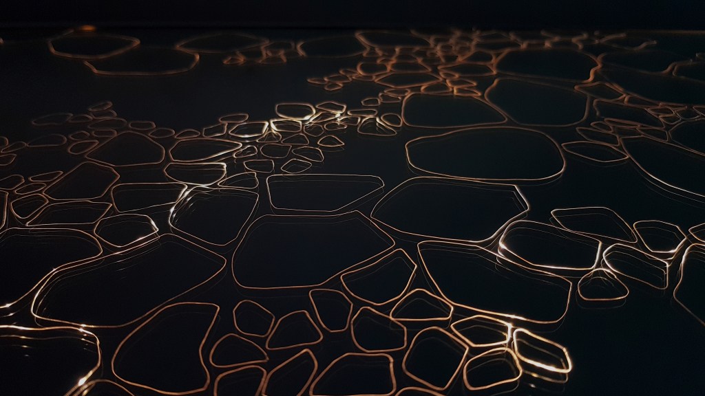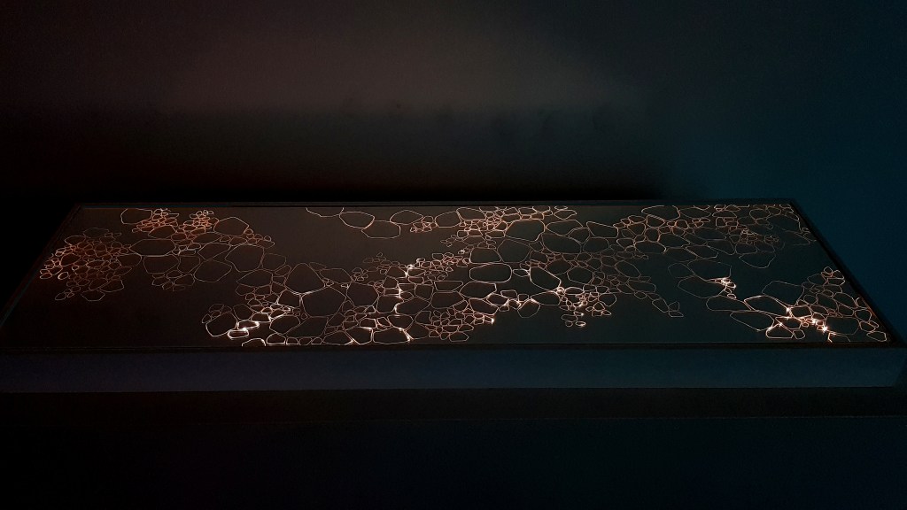 Résidence El Port de la Selva Espagne, série les vagues, encre indigo sur carton 45x145cm – 2023Verres en thermoformage, 15x22cm – 2023Rivière souterraine, miroir gravé dans caisson lumineux, 100x30cm – 2023