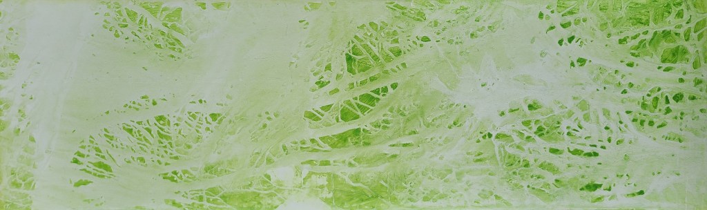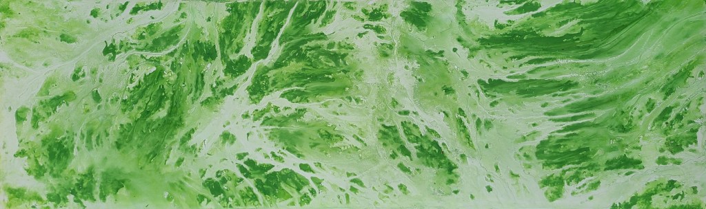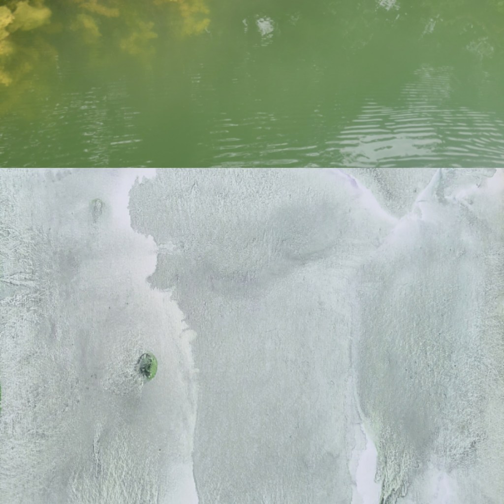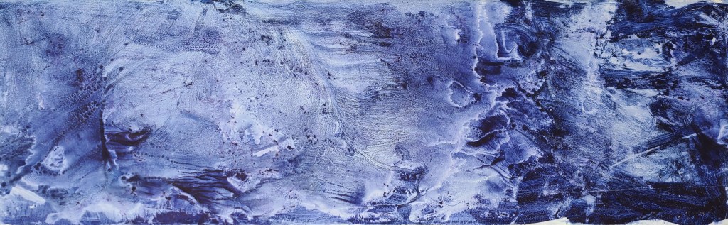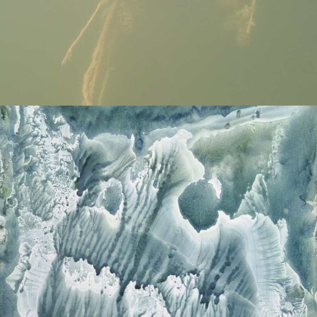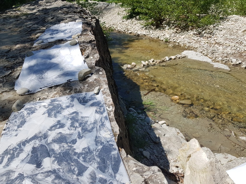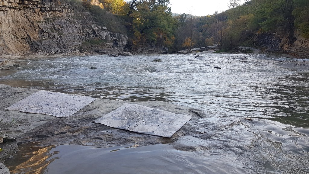 Deux mondes, mémoire du Vidourle, photo et encre sur carton, dimensions variables 42x50cm – 2025La rivière, encre lino sur carton, 45x145cm – 2024Résidences au bord du Roubion (Drôme) – 2022 à 2025Encore la rivière, encre de Chine sur intissé et limon, 45x145cm – 2024Reflets d’étang, 21 eaux-fortes 25x35cm – Étang de Thau – 2024