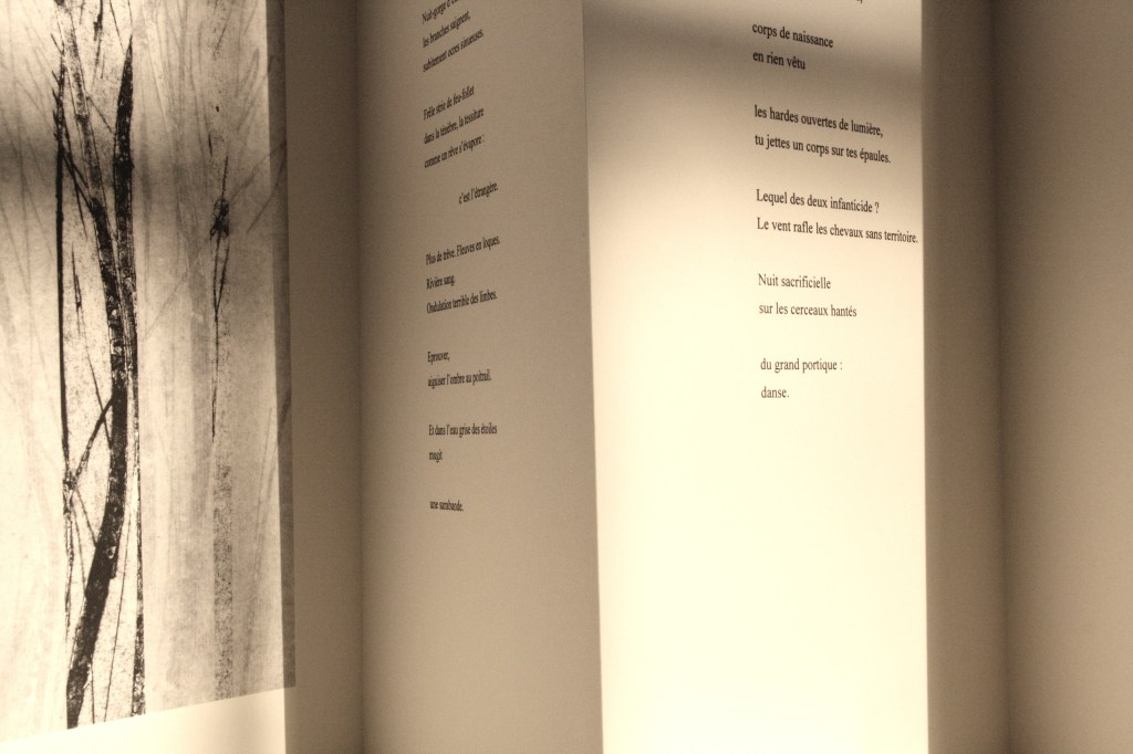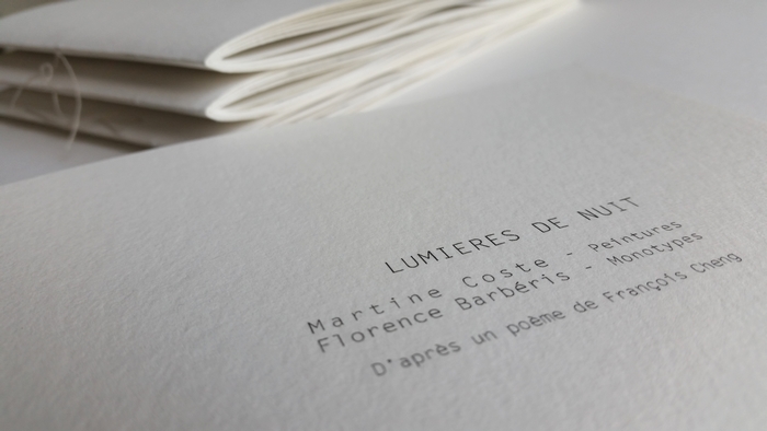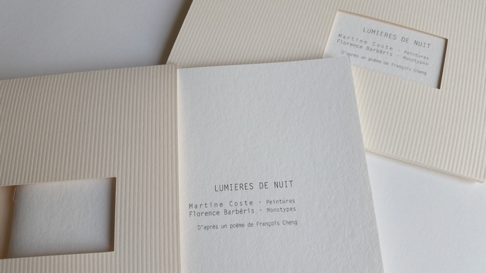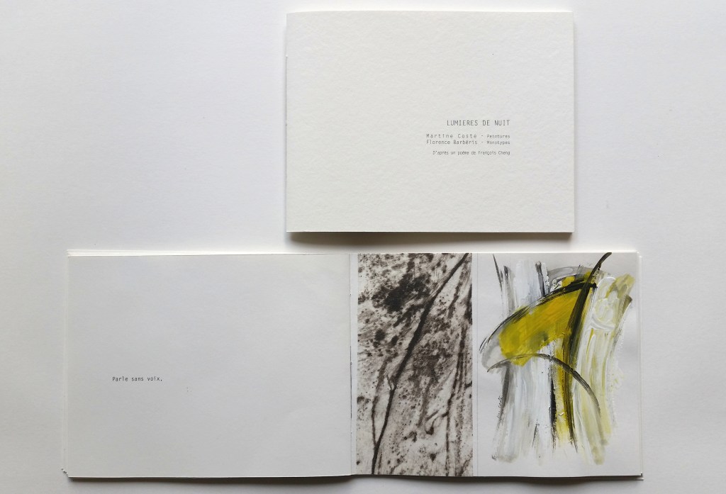 LUMIÈRE DE NUIT, peintures Martine Coste, monotypes estampés Florence Barbéris, d’après un poème de François Cheng, 22 exemplaires dont 2 manuscrits, 20,5×15,5cm, 2018