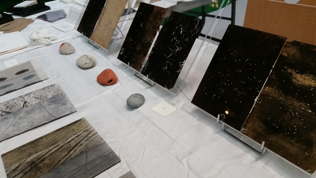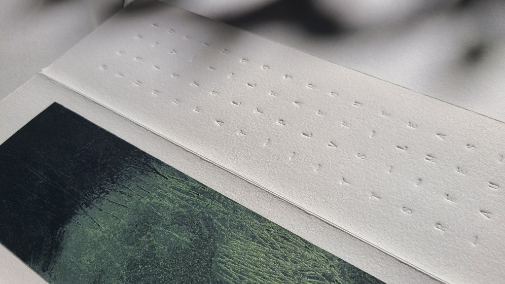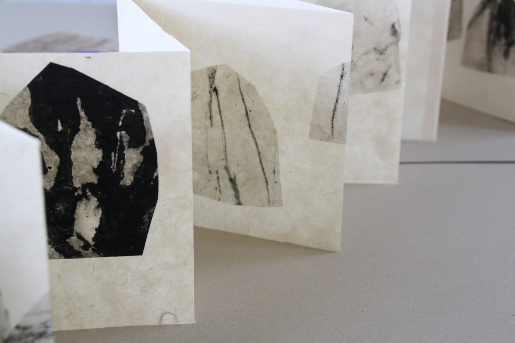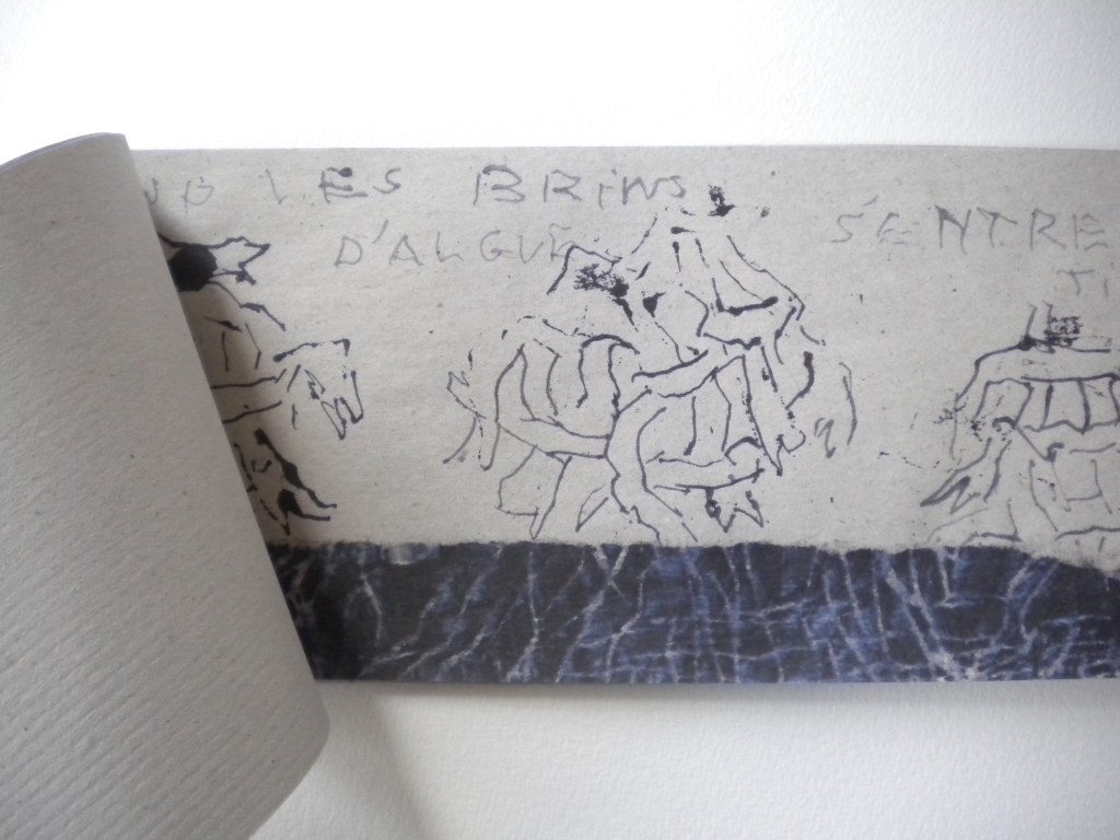 Encres originales sur intissé, texte de l’artiste, format ouvert 25x100cm, support en pierre, 7 exemplaires uniques, 2024