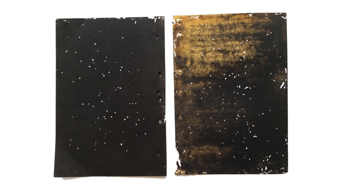 Monotypes sur vieux livres birmans grignotés par des petites bêtes, 12x17cm, en diptyque
