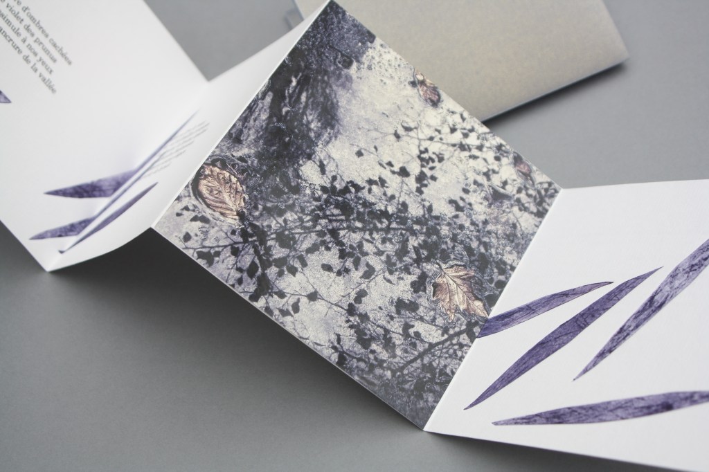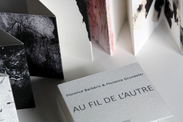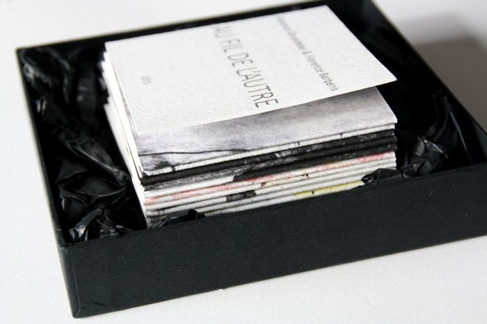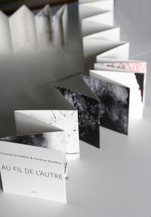 AU FIL DE L’AUTRE suite aux 2 cadavres exquis réalisés avec Florence Grundeler de décembre 2014 à mai 2015, 15x240cm une édition en 30 exemplaires chacun imprimés sur papier gravure, format plié 8,5×8,5cm, format déplié 8,5x136cm, présentés dans une boîte en carton