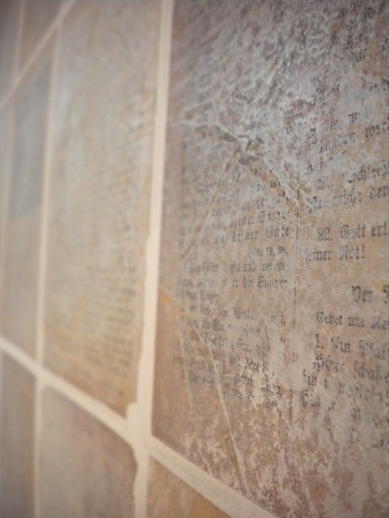UBERTRAGUNG-TRANSMISSION, livre unique constitué de 32 gravures imprimées sur 32 pages de psaumes d’une bible en allemand gothique du XIXème, rehaussées de peinture et marouflées sur un papier japon de 43x135cm, présenté dans un coffret bois de 15x20cm, 2011 – collection personnelle