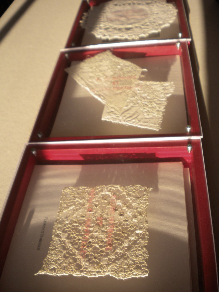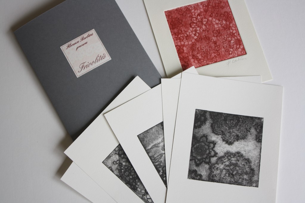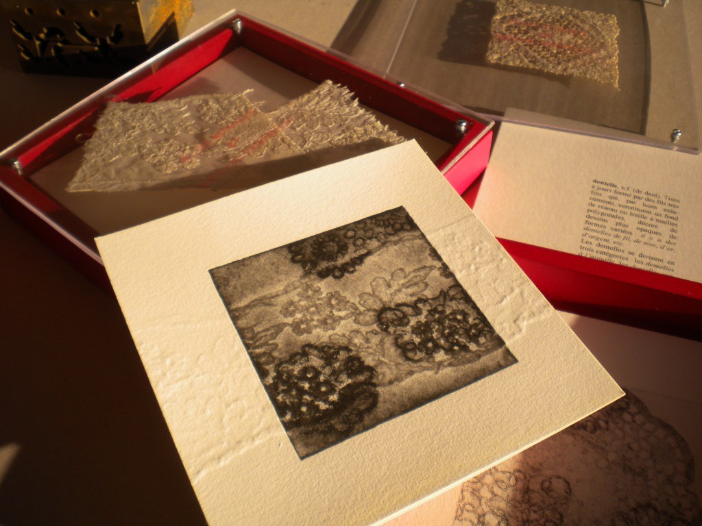 ACIDE NITRIQUE ET VIEILLES DENTELLES, 12 eaux-fortes réalisées à partir de l’album d’échantillons de dentelles de Marraine et réunies dans un coffret, 20x20cm. L’ensemble est constitué de cinq coffrets ne présentant chacun que des tirages uniques, 2011