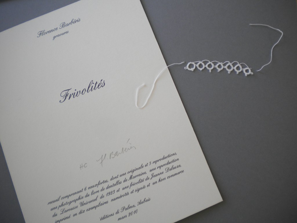 FRIVOLITÉS, recueil comprenant 6 eaux-fortes, dont une originale et 5 reproductions, une photographie du livre de dentelles de Marraine, une reproduction du Larousse Universel de 1923 et une frivolité