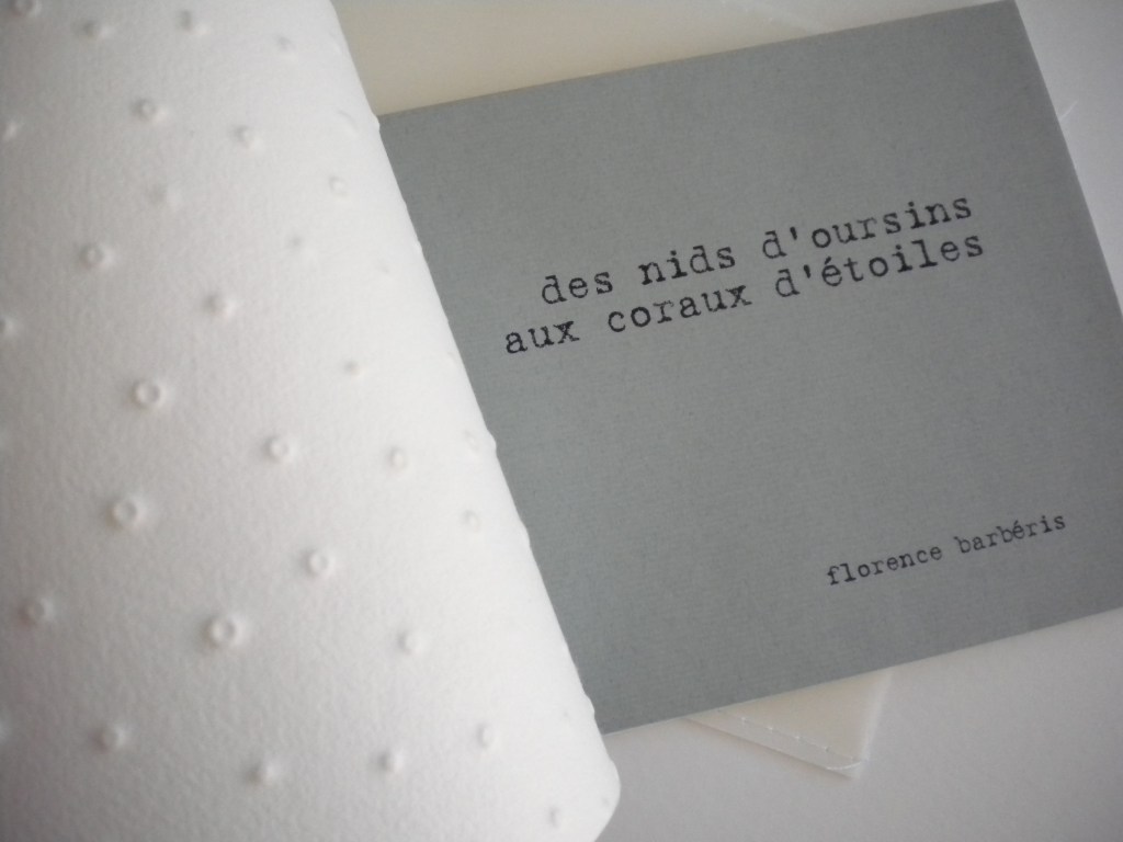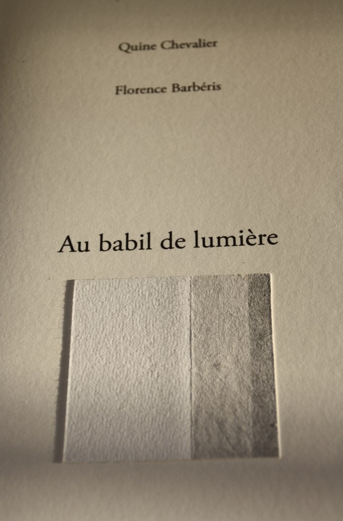 AU BABIL DE LUMIERE, éditions des Cents Regards, 20 poèmes de Quine Chevalier, reproduction de 9 gravures de Florence Barbéris, 12 exemplaires de tête avec une gravure originale et 45 exemplaires courants, 17,5x33cm, septembre 2014