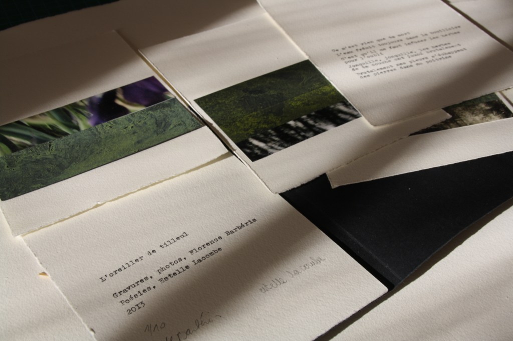 L’OREILLER DE TILLEUL, poésies Estelle Lacombe , gravures et photos , 10 exemplaires, 13x18cm, 2013