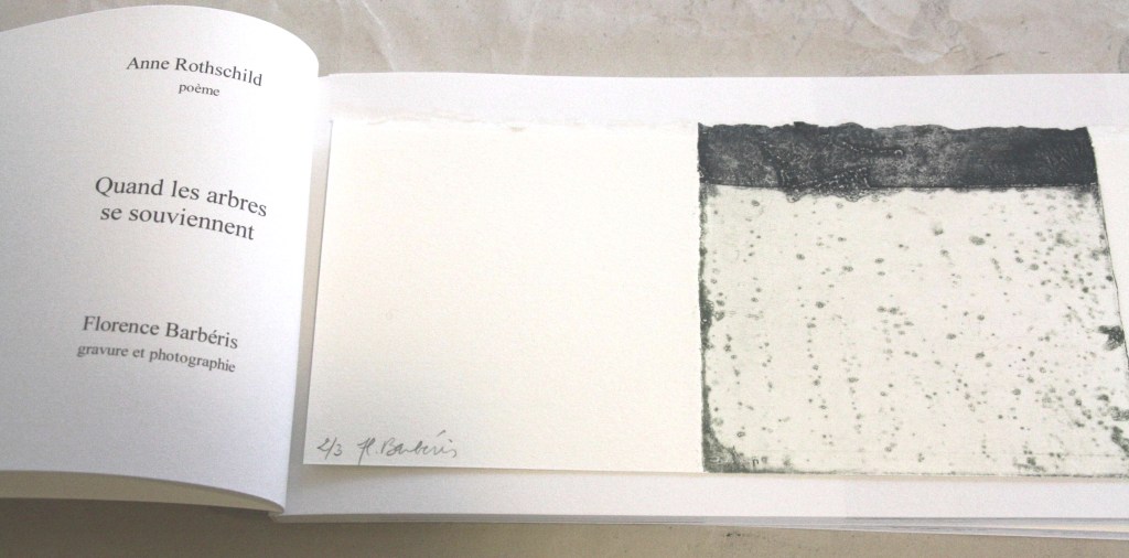 QUAND LES ARBRES SE SOUVIENNENT, Poème d’Anne Rothschild, reproduction 14 eaux-fortes et 14 photographies, avec une gravure originale pour les tirages de tête, 30 exemplaires, 14x27cm, 2014