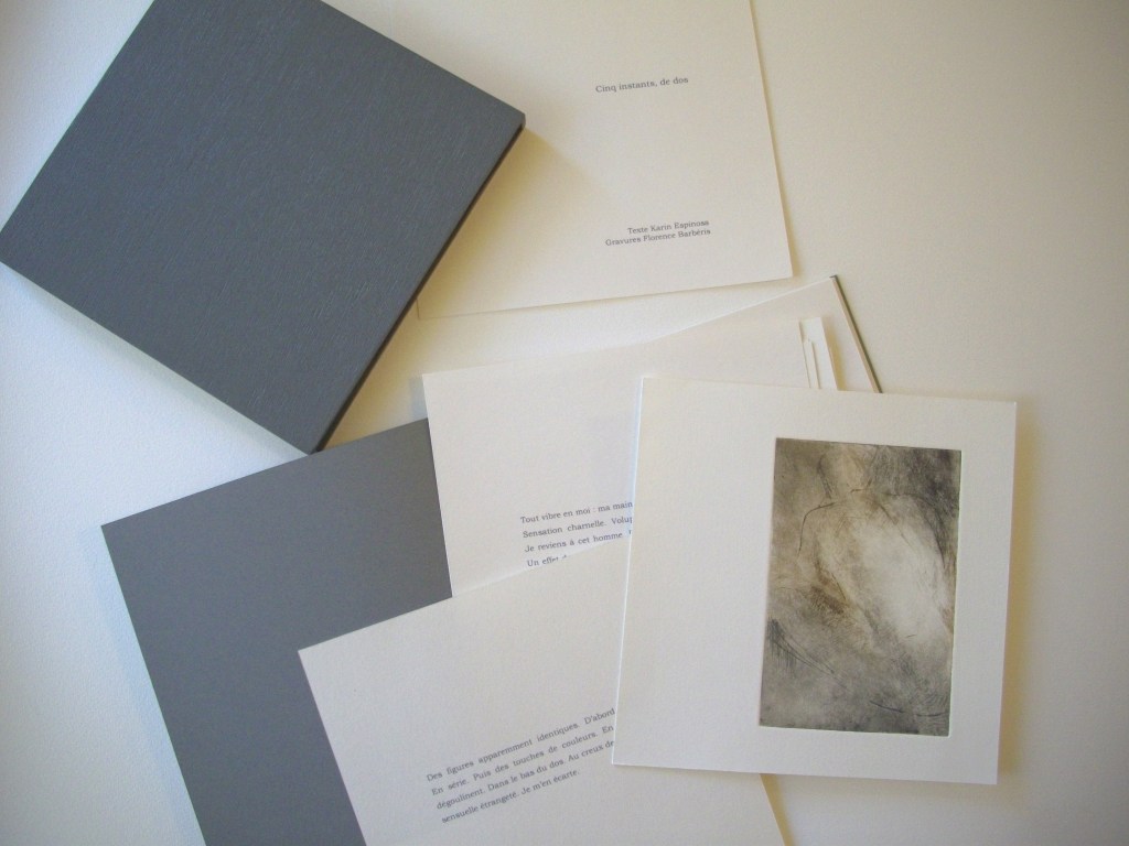 CINQ INSTANTS DE DOS, texte Karin Espinosa, 5 gravures dans un boîtier bois,